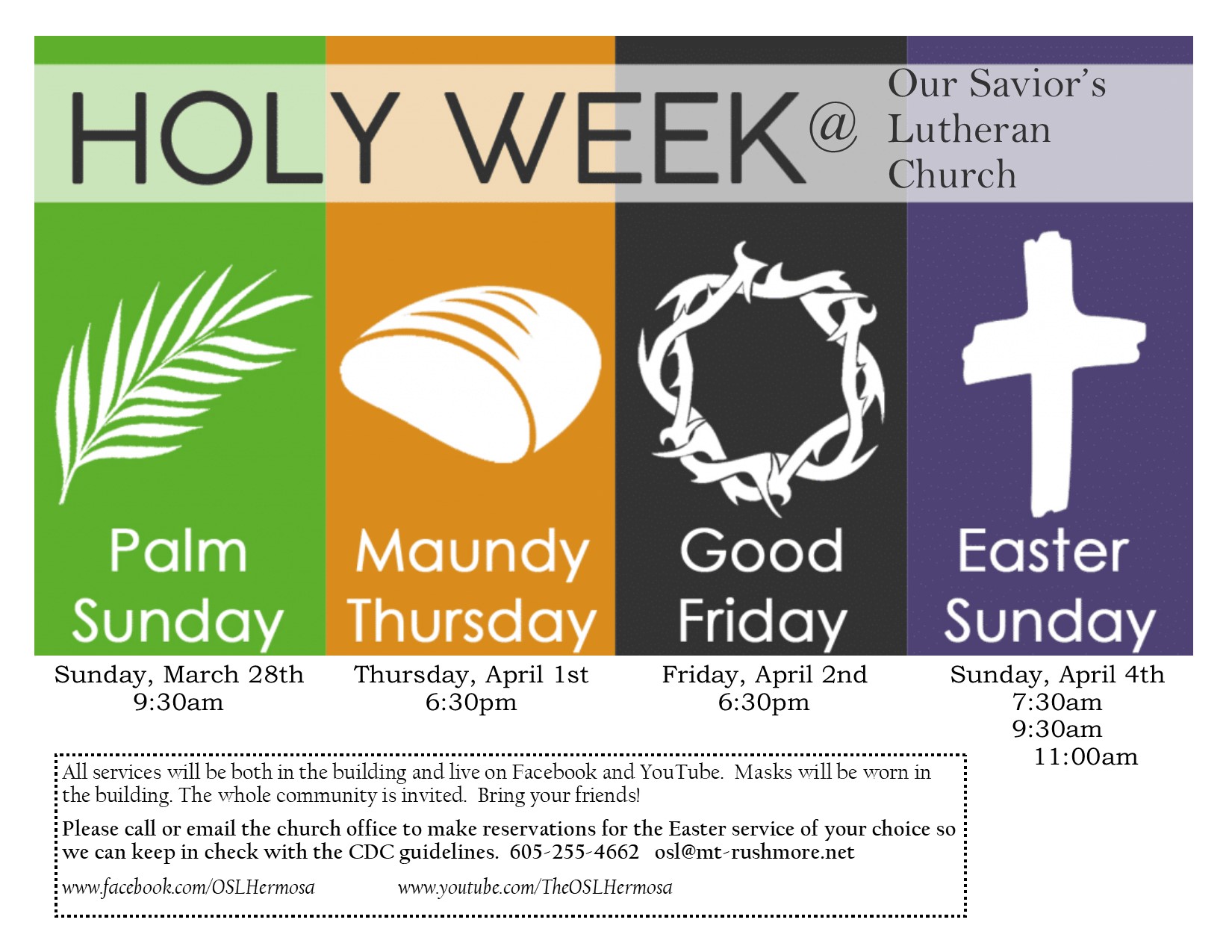 Join Pastor Deb on Palm Sunday, March 28th at 9:30am in the building, and live on Facebook and YouTube. Please remember to contact Josie with your Easter Sunday reservations. Services to choose from on Easter are at 7:30am, 9:30am and 11:00am. www.facebook.com/OSLHermosa www.youtube.com/TheOSLHermosa Church office 255-4662 or osl@mt-rushmore.net